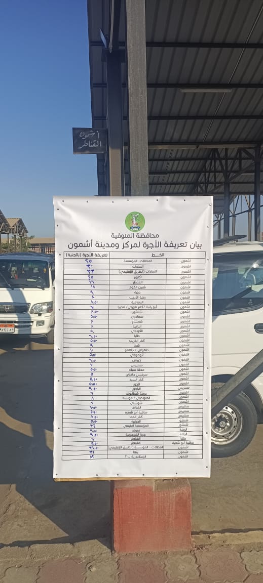 وخلال الاجتماع، وجه محافظ المنوفية رؤساء الوحدات المحلية للمراكز والمدن والأحياء بالتواجد الميداني على مدار الساعة، مع التنسيق الكامل مع إدارات المرور والتموين لتكثيف الحملات الرقابية على محطات الوقود ومواقف السيارات، والتأكد من التزام السائقين بالتعريفة الجديدة، مع إلزامهم بوضع التسعيرة بشكل واضح على زجاج المركبات. كما شدد على ضرورة وضع لافتات وبنرات معلنة داخل المواقف لتعريف المواطنين بالتعريفة المعتمدة، ومنع أي استغلال أو تحميل بأعداد زائدة حفاظاً على حقوق المواطنين.