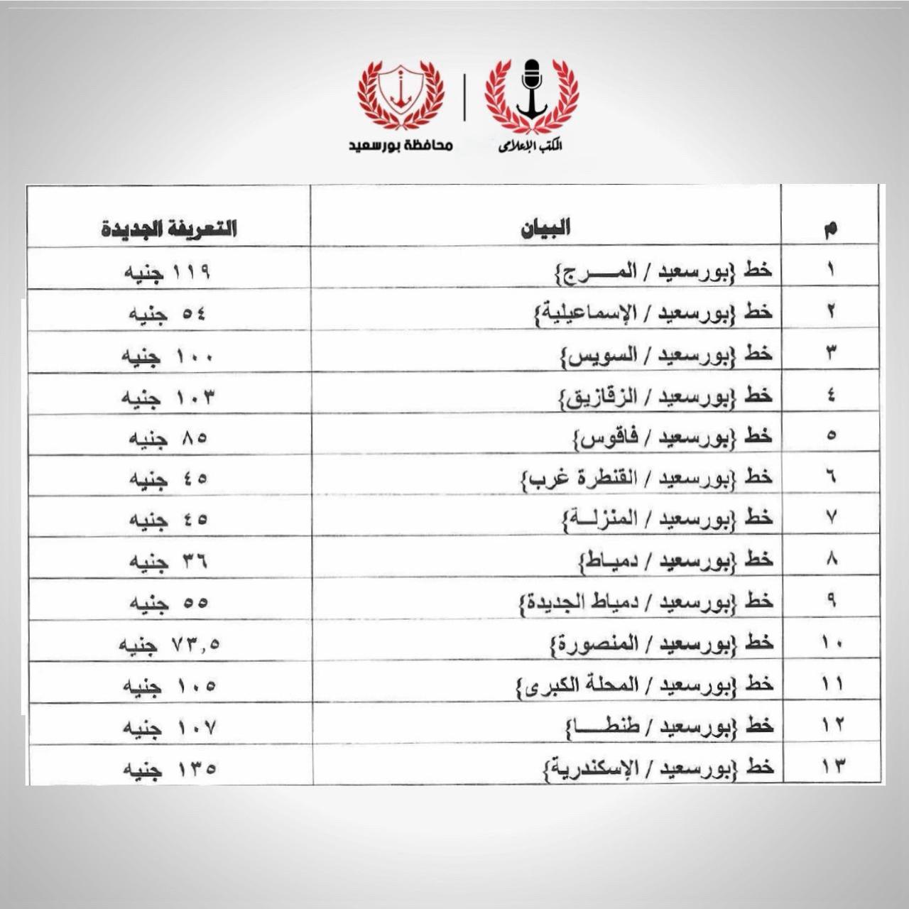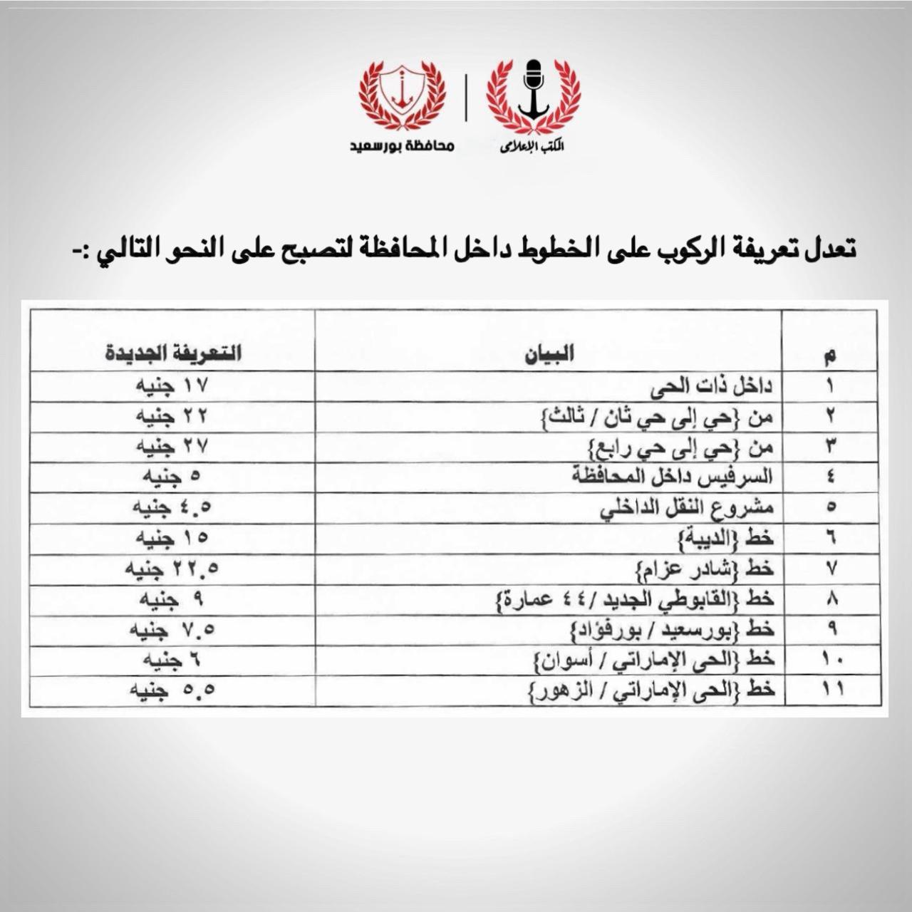 وتم تعديل تعريفة الركوب داخل محافظة بورسعيد بحيث تكون تعريفة السرفيس داخل المحافظة 5 جنيهات و تعريفة التاكسي داخل نفس الحي 17 جنيهٱ ، ومن حي إلى حي تاني أو تالت 22 جنيهٱ ، و من حي الي حي رابع 27 جنيها ، وتعريفة مشروع النقل الداخلي 4,5 جنيه، وتعريفة خط الديبة 15 جنيها، و خط شادر عزام 22,5 جنيه، و خط القابوطي الجديد و 44 عمارة 9 جنيهات، وخط الحي الاماراتي-أسوان 6 جنيهات، والحي الاماراتي ـالزهور 5,5 جنيه، خط بورسعيد بورفؤاد 7,5 جنيه.