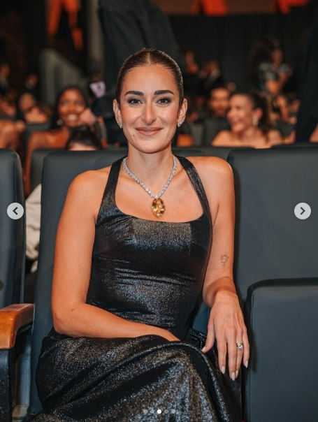 خطفت أمينة خليل الأنظار بإطلالة جمعت بين البساطة والأناقة، حيث ارتدت فستان طويل ذا أكمام مكشوفة واتسم التصميم باللون الأسود اللامع.