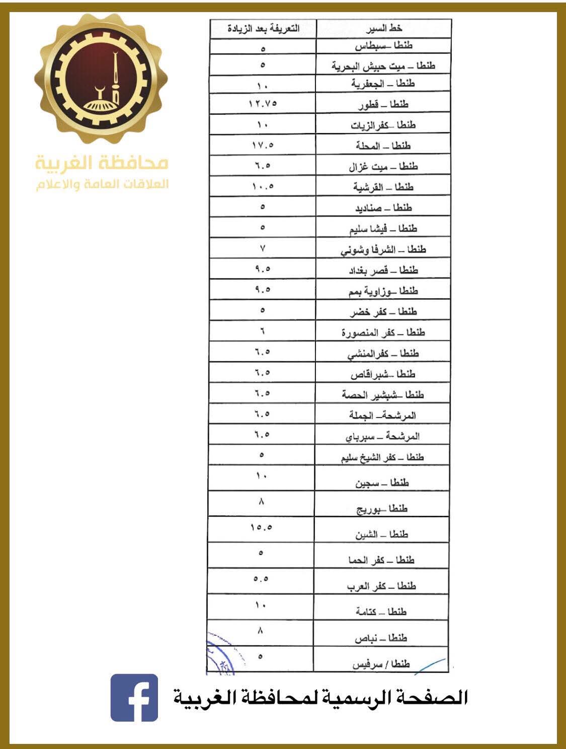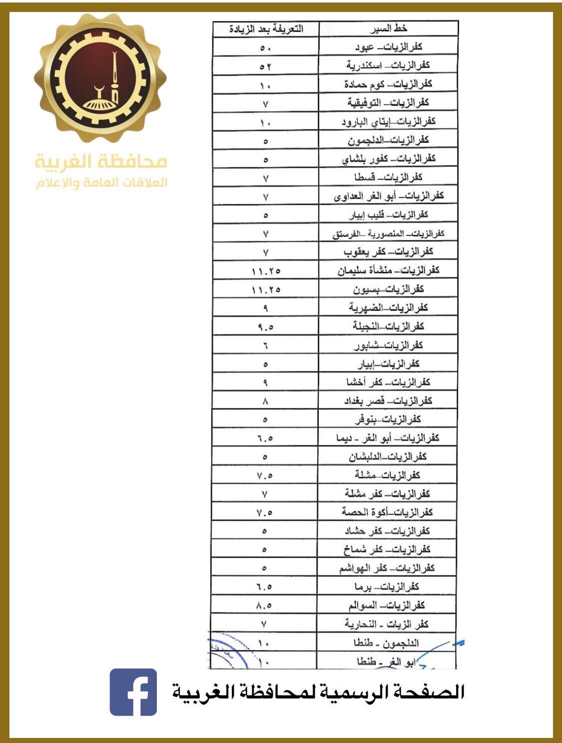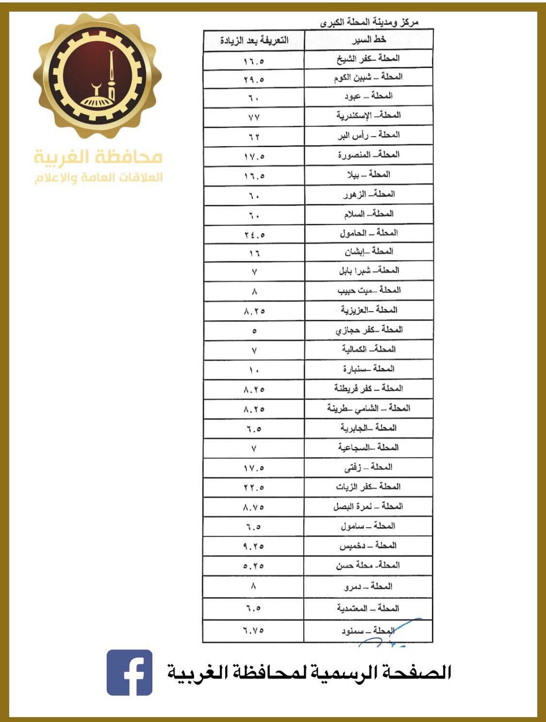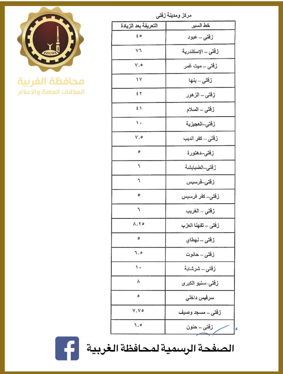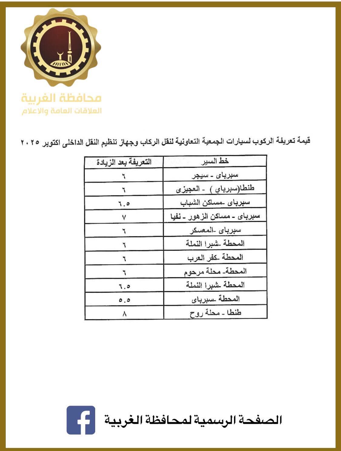 أعلن اللواء أشرف الجندي محافظ الغربية، اعتماد التعريفة الجديدة لوسائل النقل الداخلي والخارجي بجميع مراكز ومدن المحافظة، وذلك عقب قرار لجنة التسعير التلقائي للمنتجات البترولية بتحريك أسعار الوقود اعتبارًا من الساعة السادسة صباح اليوم الجمعة 17 أكتوبر 2025، مع تثبيت الأسعار داخل السوق المحلي لمدة عام كامل كحد أدنى.