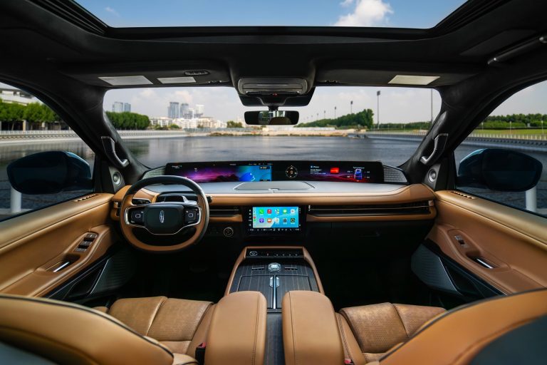 تضم لوحة القيادة شاشة بانورامية ضخمة بقياس 48 بوصة تمتد بكامل عرض المقصورة، تُغذيها واجهة عرض مركزية تعمل باللمس بقياس 11.1 بوصة، هذه المنظومة تكتمل مع نظام صوتي ثلاثي الأبعاد من Revel Ultima مدعوم بعدد 28 مكبر صوت.