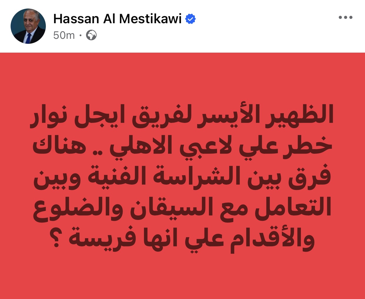 وكتب المستكاوي عبر حسابه الرسمي على موقع التواصل الاجتماعي “فيسبوك”: “الظهير الأيسر لفريق إيجل نوار خطر على لاعبي الأهلي.. هناك فرق بين الشراسة الفنية وبين التعامل مع السيقان والضلوع والأقدام على أنها فريسة".