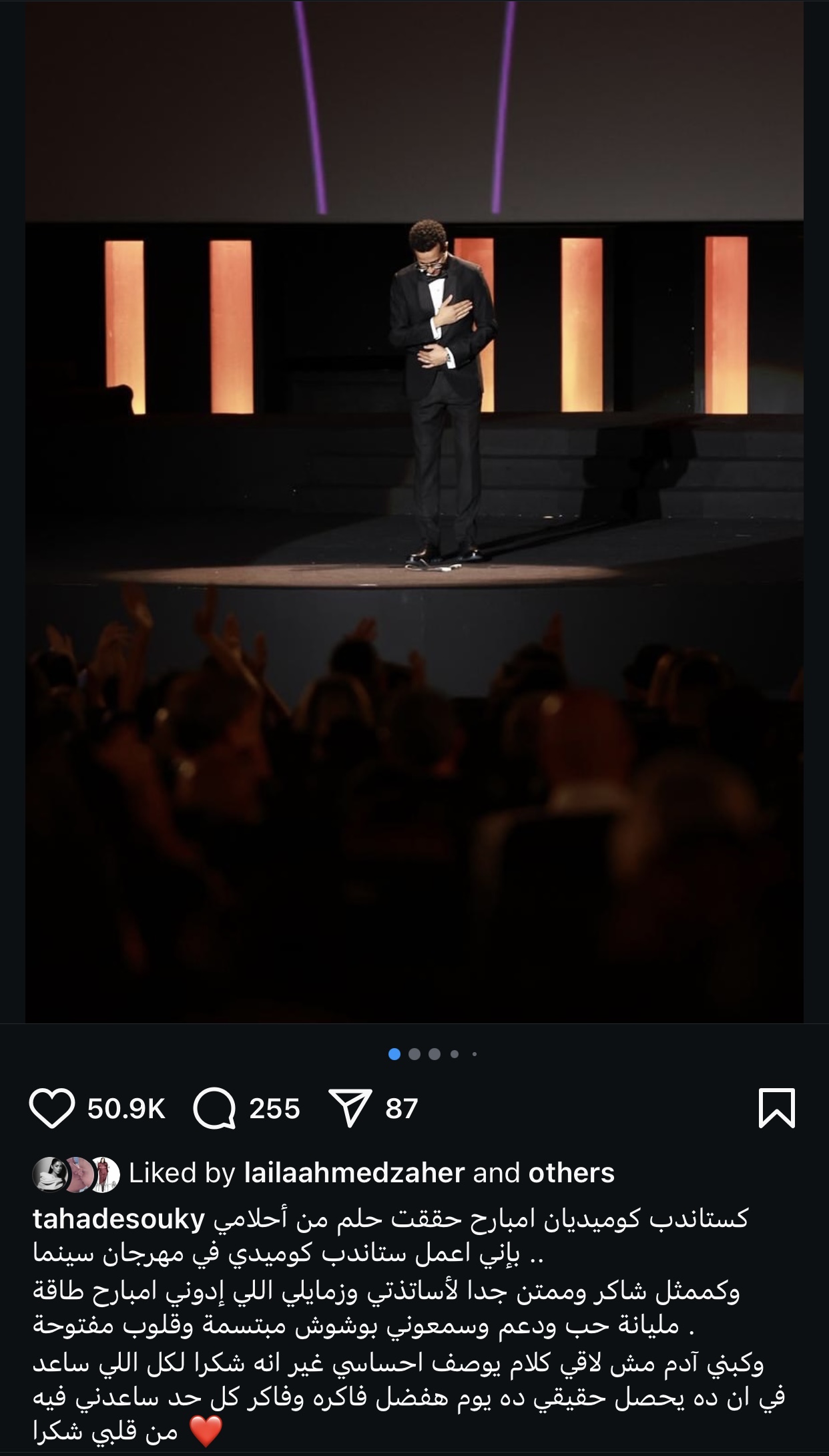 وكتب طه دسوقي على حسابه الشخصي بموقع إنستجرام: “كستاندب كوميديان امبارح حققت حلما من أحلامي بإني اعمل ستاندب كوميدي في مهرجان سينما”.