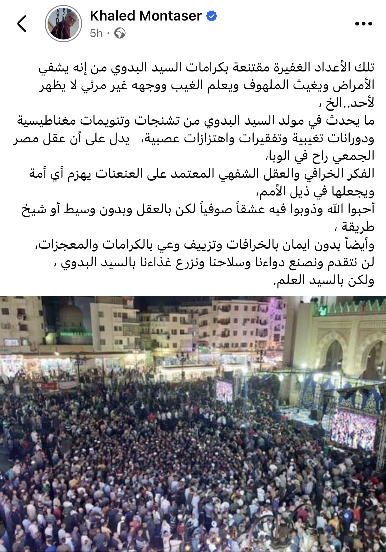 وكتب خالد منتصر على حسابه الشخصي بموقع فيسبوك: “تلك الأعداد الغفيرة مقتنعة بكرامات السيد البدوي من إنه يشفي الأمراض ويغيث الملهوف ويعلم الغيب ووجهه غير مرئي لا يظهر لأحد..الخ”.
