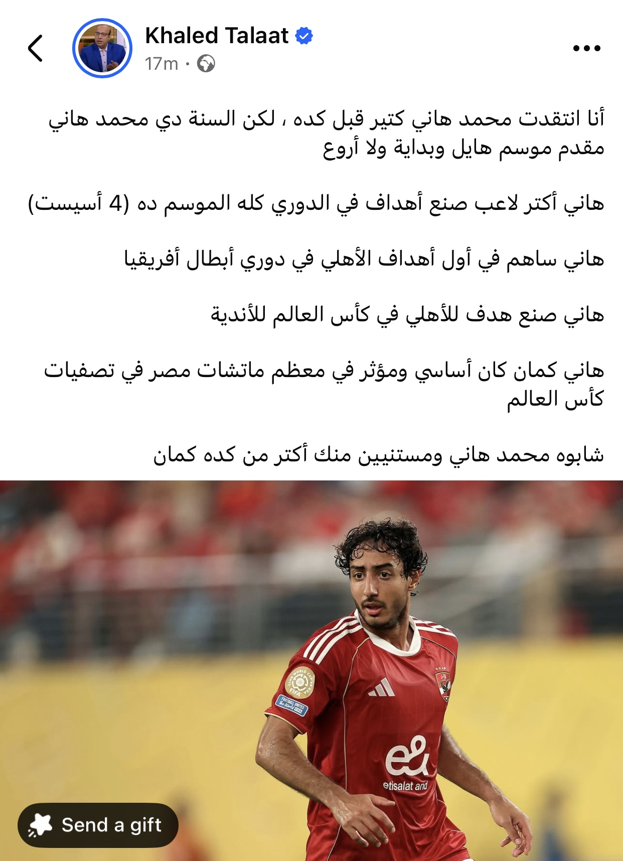 كما لفت طلعت إلى أن اللاعب كان أساسيًا ومؤثرًا في معظم مباريات منتخب مصر في تصفيات كأس العالم، مؤكدًا في ختام حديثه: “شابوه محمد هاني ومستنيين منك أكتر من كده كمان”.