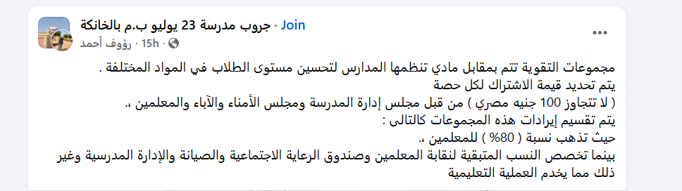 ونص القرار كذلك على أن يختص مجلس إدارة المدرسة بتحديد قيمة مبلغ الاشتراك بالمجموعة، على أن يكون تحديدها على أساس مقابل الحصة الواحدة، ويعتمد مجلس الأمناء والآباء والمعلمين بالمدرسة قيمة مبلغ اشتراك الحصة الواحدة، على ألا تتجاوز قيمة اشتراك المجموعة (۱۰۰) جنيه مصري للطالب الواحد في الحصة، على أن يُراعى مجلس إدارة المدرسة ومجلس الأمناء والآباء والمعلمين بالمدرسة الوضع الاقتصادي والظروف الاجتماعية لغالبية طلاب المدرسة عند تحديد قيمة الاشتراك.