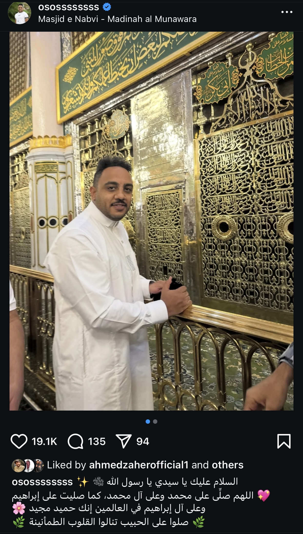 وظهر أوس أوس في الصور مرتديًا بعباءة وعلق عليها قائلاً: “السلام عليك يا سيدي يا رسول اللّٰه، اللهم صلّى على محمد وعلى آل محمد، كما صليت على إبراهيم وعلى آل إبراهيم في العالمين إنك حميد مجيد صلوا على الحبيب تنالوا القلوب الطمأنينة”.