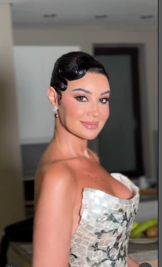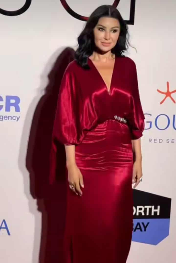 كان فستان الفنانة أروى جودة طويل ماكسي والنصف العلوى بتصميم يشبه الفراشة مع ميك اب سواريه هادئ.