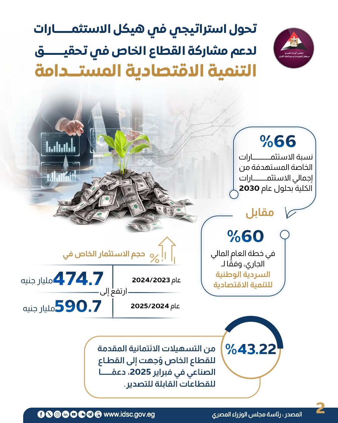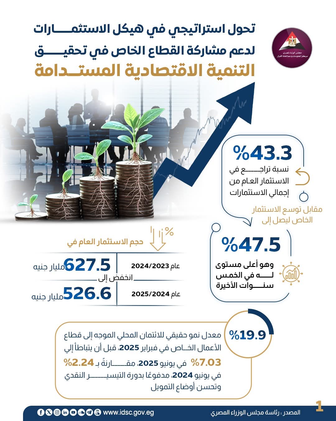 وأوضح الانفوجرا ان حصة الاستثما الخاص ارتفعت إلى 47.5% من إجمالي الاستثمارات، وهو أعلى مستوى له خلال خمس سنوات، مقابل تراجع الاستثمار العام إلى 43.3%، ويأتي هذا التحول في إطار توجه الدولة نحو ترشيد الاستثمارات العامة وتعزيز دور القطاع الخاص ليقود النمو الاقتصادي المستدام.