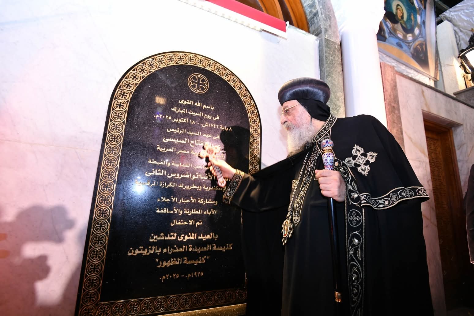 وتوجه قداسة البابا لدى وصوله إلى الكنيسة المحتفل بها والتي شهدت ظهور السيدة العذراء عام ١٩٦٨، حيث أزاح الستار عن اللوحة التذكارية التي تؤرخ للمناسبة، وصلى صلاة الشكر وتفقد معرض مقتنيات الكنيسة عبر مئة عام.