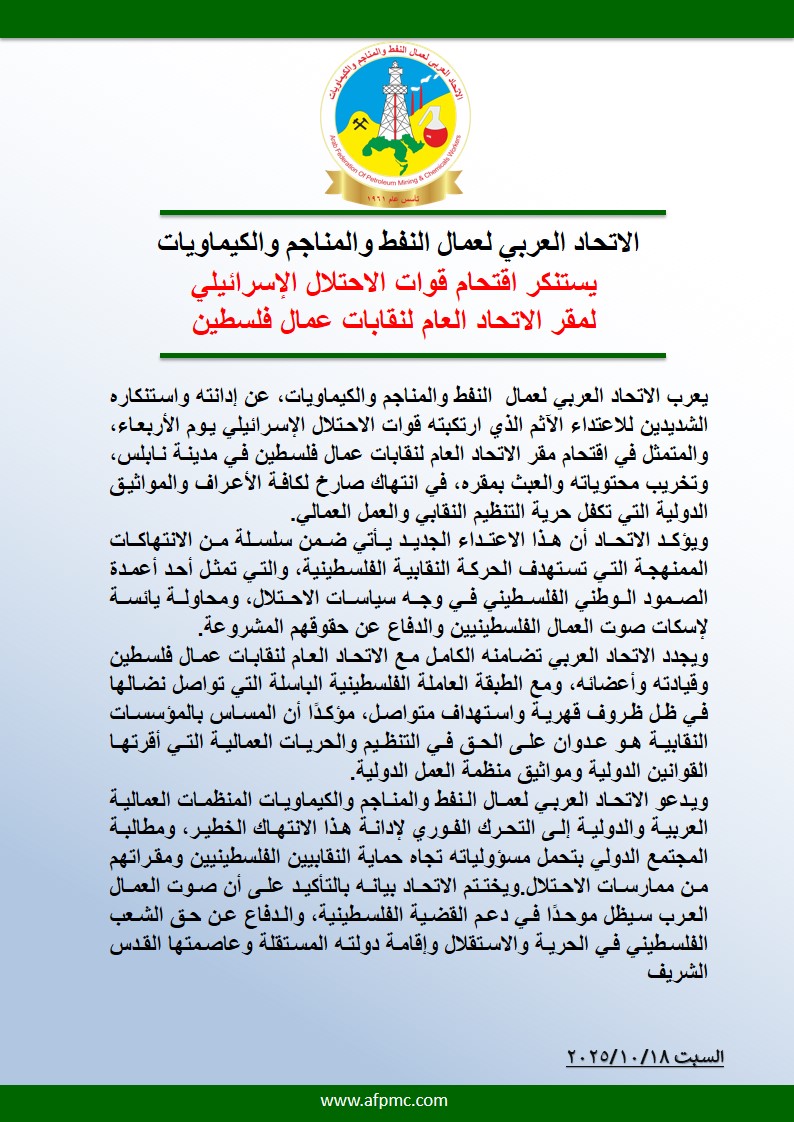 أعرب الاتحاد العربي للنفط والمناجم والكيماويات، عن إدانته واستنكاره الشديدين للاعتداء الآثم الذي ارتكبته قوات الاحتلال الإسرائيلي يوم الأربعاء، والمتمثل في اقتحام مقر الاتحاد العام لنقابات عمال فلسطين في مدينة نابلس، وتخريب محتوياته والعبث بمقره، في انتهاك صارخ لكافة الأعراف والمواثيق الدولية التي تكفل حرية التنظيم النقابي والعمل العمالي.