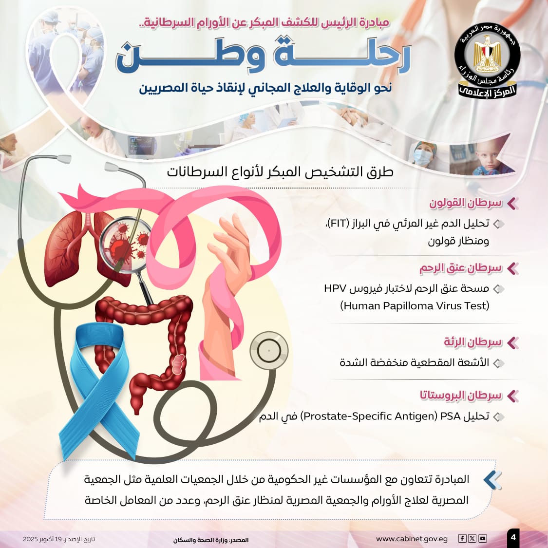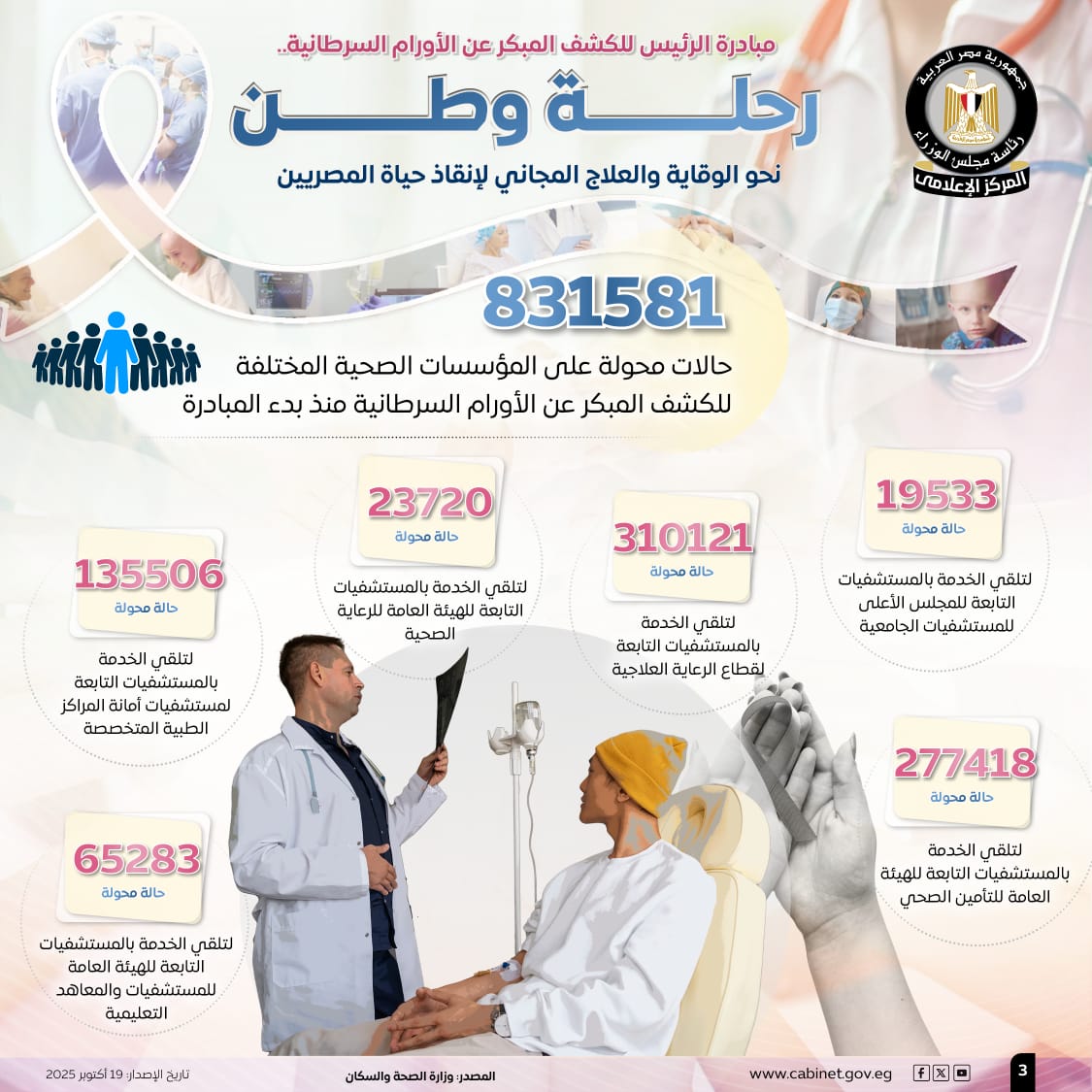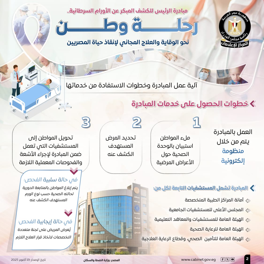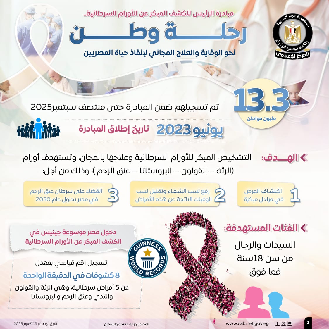 نشر المركز الإعلامي لمجلس الوزراء عددًا من الإنفوجرافات عبر منصاته على مواقع التواصل الاجتماعي، سلط من خلالها الضوء على جهود الدولة في مكافحة الأورام السرطانية من خلال المبادرة الرئاسية للكشف المبكر عن الأورام وذلك في إطار حرص الدولة على بناء نظام صحي متكامل يضمن الارتقاء بصحة المواطنين، مع الاستمرار في تحقيق التغطية الصحية الشاملة وفقًا لأعلى المعايير العالمية، وتُعد المبادرة الرئاسية للكشف المبكر عن الأورام السرطانية إحدى الركائز الأساسية لهذه الجهود، إذ تعكس التزام الدولة بمواجهة الأمراض غير السارية، وفي مقدماتها الأورام السرطانية، عبر الاكتشاف المبكر وتقديم العلاج المجاني في المراحل الأولى، بما يسهم في رفع نسب الشفاء، وخفض معدلات الوفيات، وتعزيز الأمان الصحي للمواطنين.