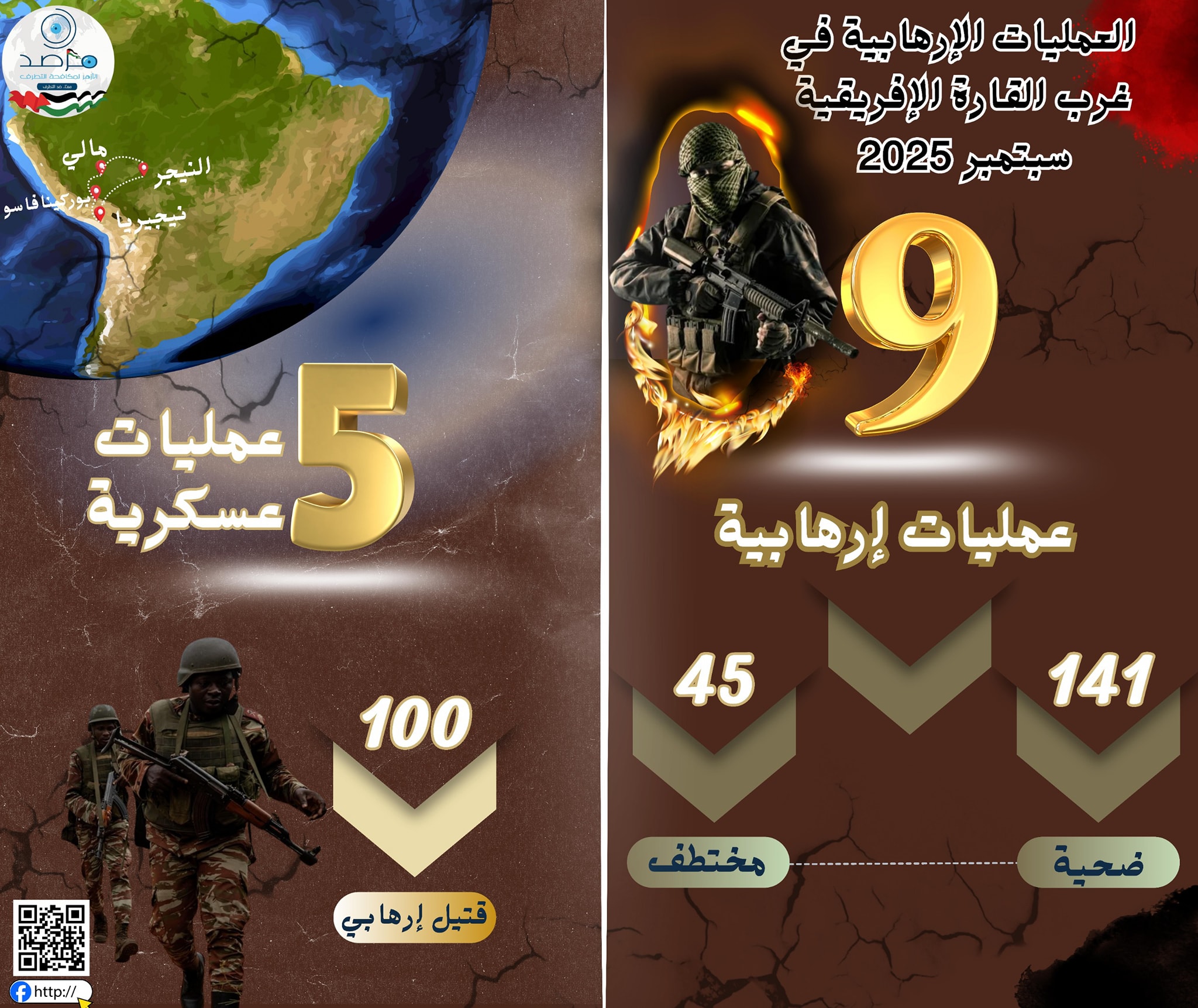 فيما يخص جهود مكافحة التنظيمات الإرهابية، نفذت القوات الأمنية في غرب إفريقيا 5 عمليات عسكرية ناجحة خلال سبتمبر 2025، أسفرت عن تحييد 100 عنصر إرهابي.