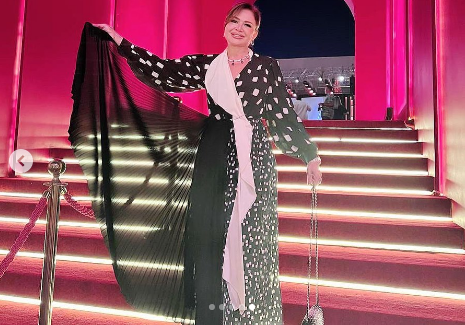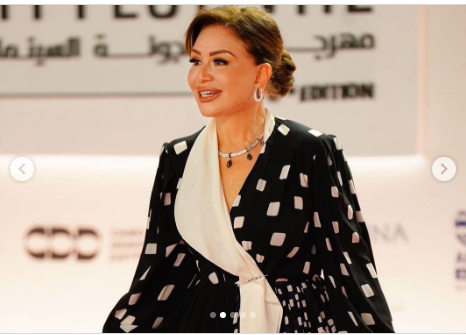 تألقت إلهام شاهين في الصور بإطلالة راقية، حيث ارتدت فستان طويل ذا أكمام طويلة وجمع التصميم بين اللون الأبيض في أسود مما زاد من اناقتها.