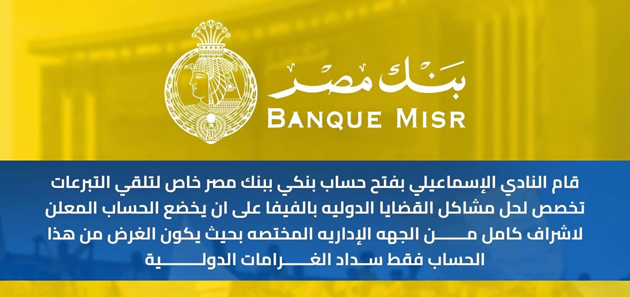 أعلن مجلس إدارة النادي الإسماعيلي عن فتح حساب بنكي خاص بأحد البنوك المصرية لتلقي التبرعات المخصصة لحل العقوبات الدولية الموقعة ضد النادي من الاتحاد الدولي لكرة القدم (فيفا)، على أن يخضع الحساب لإشراف كامل من الجهات الإدارية المختصة، ويُستخدم حصريًا في سداد الغرامات الدولية الواقعة على النادي.