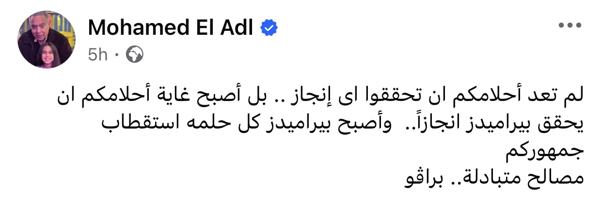 وكتب العدل، على حسابه الشخصي بموقع فيسبوك: “لم تعد أحلامكم أن تحققوا أي إنجاز، بل أصبح غاية أحلامكم أن يحقق بيراميدز إنجازاً.. وأصبح بيراميدز كل حلمه استقطاب جمهوركم.. مصالح متبادلة.. برافو”