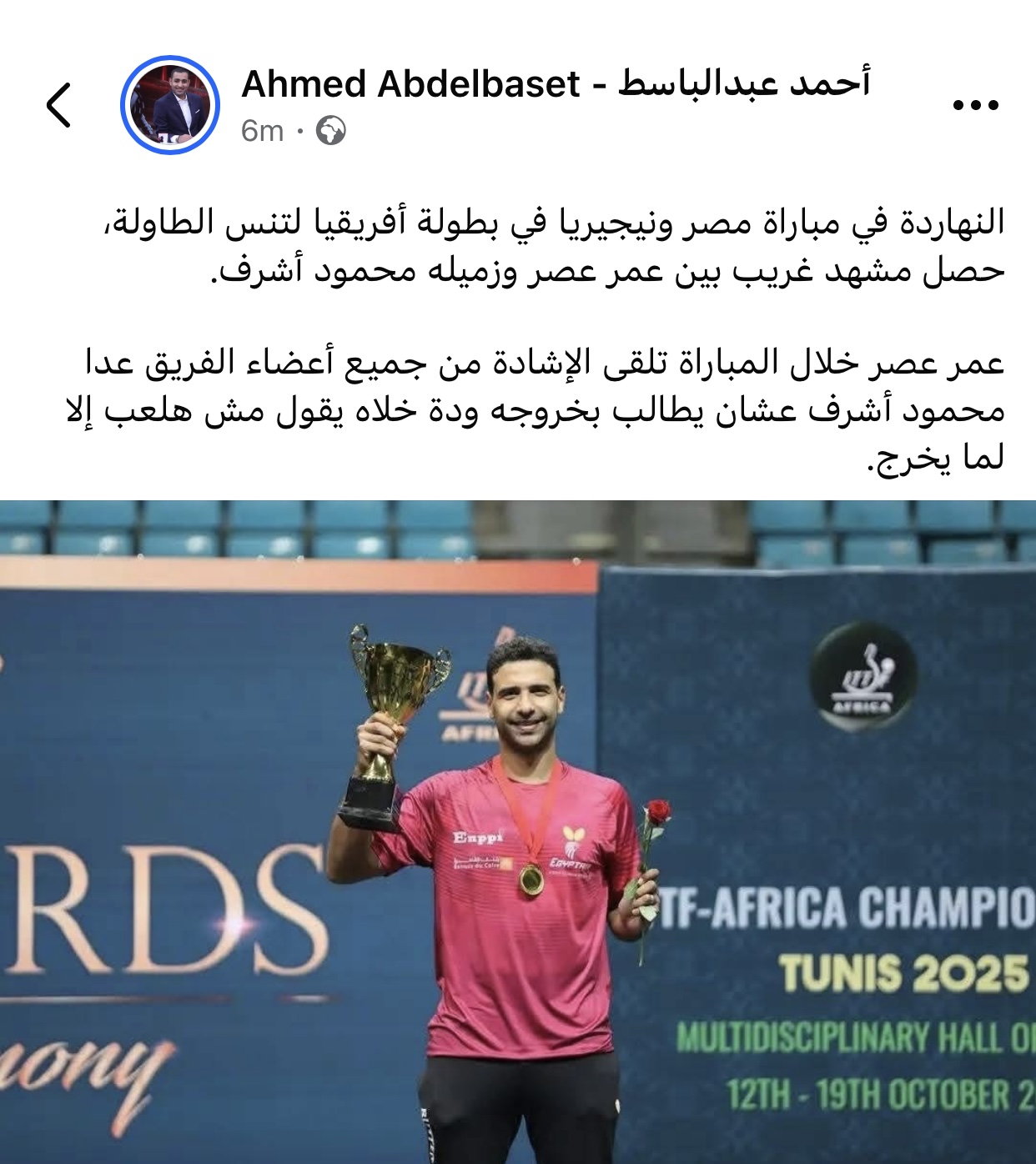 شارك الناقد الرياضي أحمد عبدالباسط، موقفًا شهدته مباراة المنتخب المصري لتنس الطاولة أمام نظيره النيجيري، اليوم، في بطولة أفريقيا لتنس الطاولة، والذي أثار الجدل بين لاعبي المنتخب عمر عصر ومحمود أشرف.
