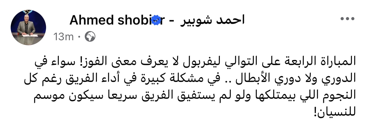 وكتب شوبير، عبر حسابه الرسمي على موقع “فيس بوك”: "المباراة الرابعة على التوالي ليفربول لا يعرف معنى الفوز!، سواء في الدوري ولا دوري الأبطال.. في مشكلة كبيرة في أداء الفريق رغم كل النجوم اللي بيمتلكها، ولو لم يستفيق الفريق سريعا؛ سيكون موسم للنسيان".