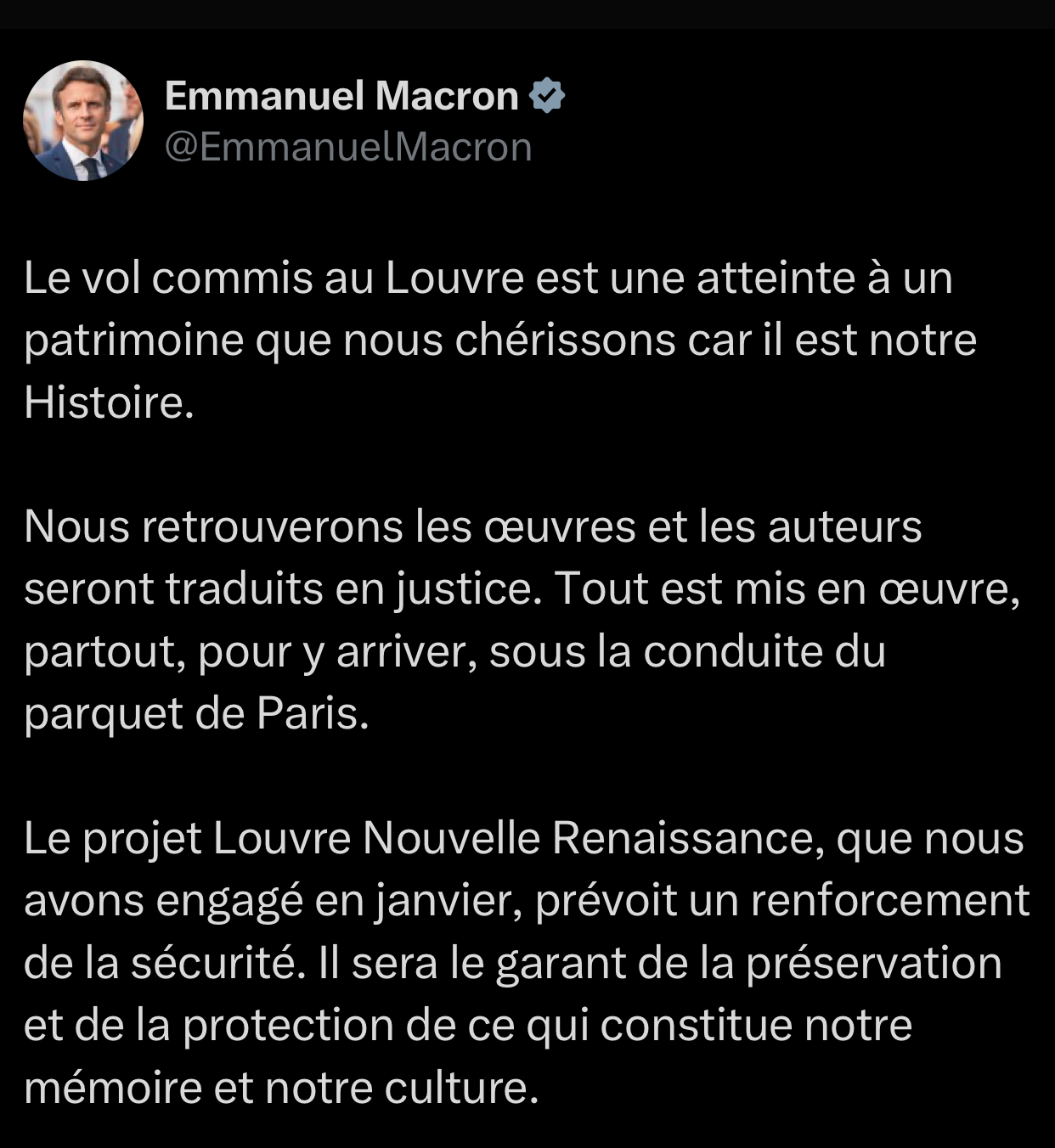 وقال ماكرون في منشور عبر حسابه الرسمي على موقع التواصل الاجتماعي إكس: “السرقة التي ارتُكبت في متحف اللوفر هي اعتداء على تراث نعتزّ به لأنه يمثل تاريخنا. سنعثر على الأعمال المسروقة، وسيُقدَّم الجناة إلى العدالة. يتم بذل كل الجهود، في كل مكان، لتحقيق ذلك، تحت إشراف نيابة باريس”.
