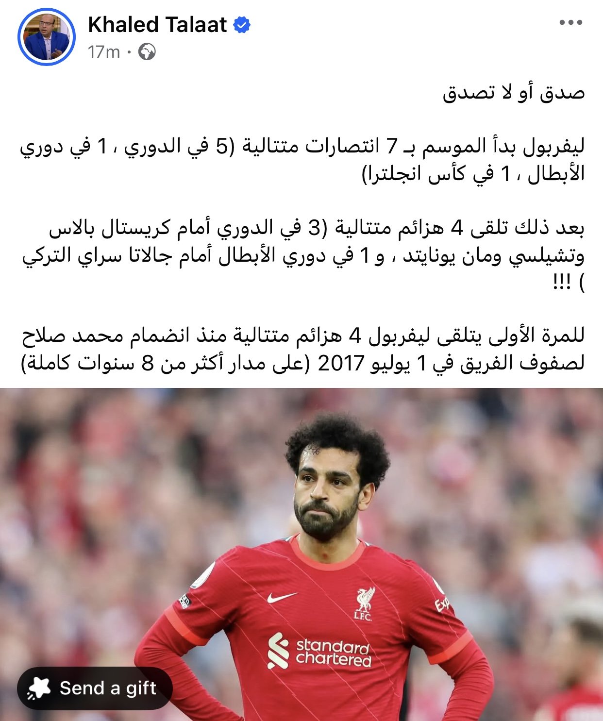 وكتب طلعت على حسابه الشخصي بموقع فيسبوك: "صدق أو لا تصدق، ليفربول بدأ الموسم ب 7 انتصارات متتالية (5 في الدوري ، 1 في دوري الأبطال ، 1 في كأس انجلترا) بعد ذلك تلقى 4 هزائم متتالية (3 في الدوري أمام كريستال بالاس وتشيلسي ومان يونايتد ، و 1 في دوري الأبطال أمام جالاتا سراي التركي (للمرة الأولى يتلقى ليفربول 4 هزائم متتالية منذ انضمام محمد صلاح صفوف الفريق في 1 يوليو 2017 (على مدار أكثر من 8 سنوات كاملة)".