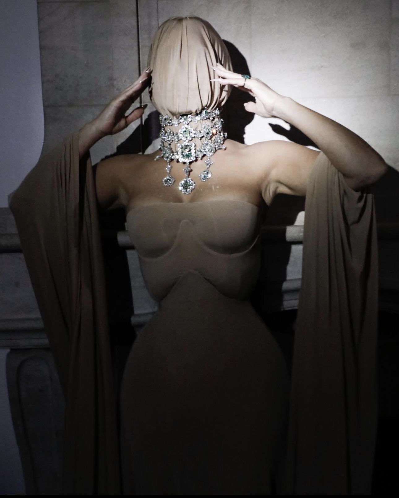 قد حمل فستان كيم كاردشيان توقيع Maison margiela، ولفتت الأنظار بقناع من نفس قماش الفستان على وجهها وهو ما جعلها محط أنظار الجميع.