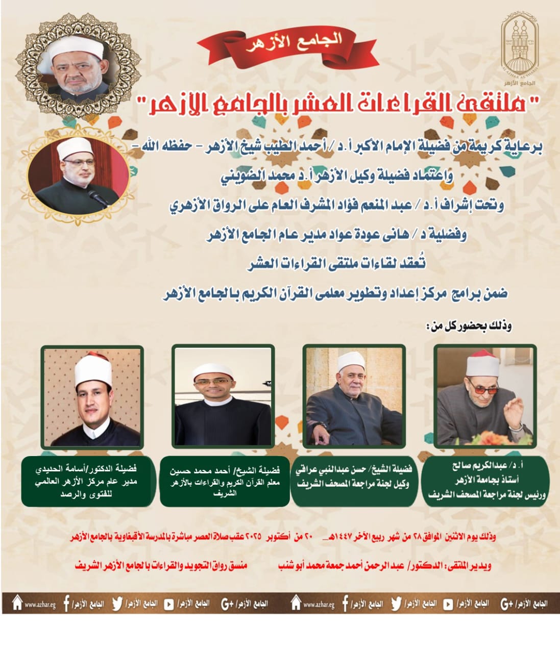 وصرح أ.د عبد المنعم فؤاد المشرف العام على الأنشطة العلمية للرواق الأزهري بالجامع الأزهر، أن هذا البرنامج يأتي ضمن سلسلة من الأنشطة والبرامج التي ينظمها مركز إعداد وتطوير معلمي القرآن الكريم بالجامع الأزهر، ويهدف إلى قراءة القرآن الكريم كاملاً بالقراءات الثلاثة المتممة للعشر، بواقع نصف جزء يومياً، مع تقديم شرح مفصل للتلاوة وتعريف بأصول القراء ومذاهبهم، كما سيتناول الملتقى التنبيه على الكلمات الفرشية المختلف فيها بين القراء، مما يسهم في تعزيز الفهم العميق للقراءات العشر المتواترة ورفع مستوى التلاوة بين المشاركين.