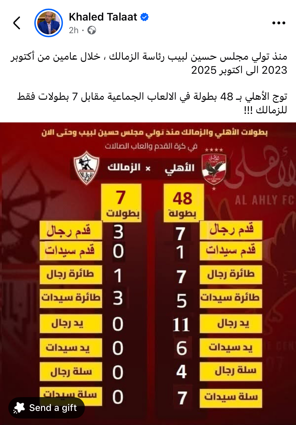 وقال طلعت في منشوره: “منذ تولي مجلس حسين لبيب رئاسة الزمالك ، خلال عامين من أكتوبر 2023 الى اكتوبر 2025، توج الأهلي بـ 48 بطولة في الالعاب الجماعية مقابل 7 بطولات فقط للزمالك”.
