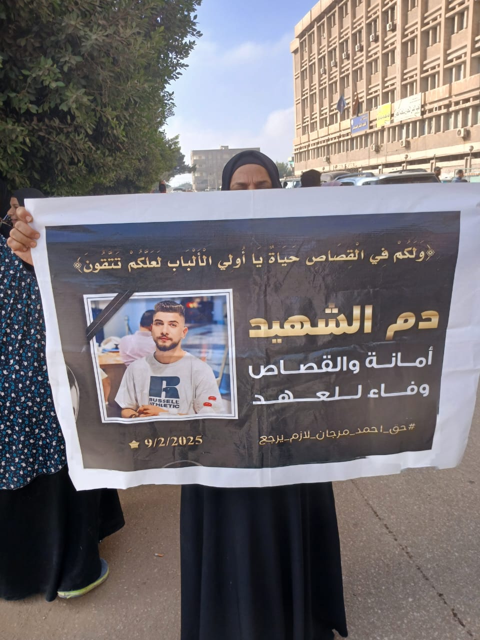 شهد محيط مجمع محاكم المحلة اليوم وقفة سلمية شارك خلالها العشرات من أفراد أسرة الشاب أحمد مرجان ضحية الغدر رميا بالرصاص رافعين لافتات كتب عليها عدة شعارات أهمها "القصاص القانوني وإعدام الجناة مطلب شرعي" و"عاوزين حق ابننا اللي انضرب بالرصاص" و"نام ارتاح يا احمد العدالة القانونية واجب تحقيقها".