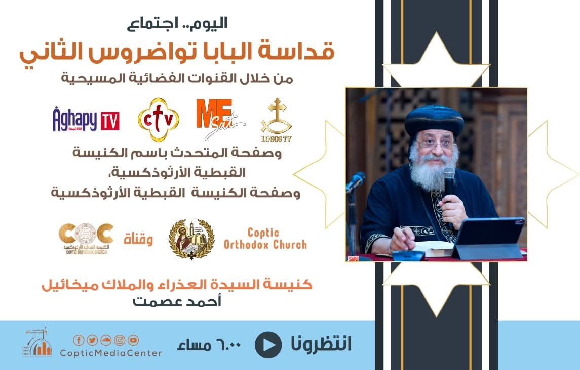 يعقد قداسة البابا تواضروس الثاني، بابا الإسكندرية وبطريرك الكرازة المرقسية، اجتماعه الأسبوعي، مساء اليوم، في تمام الساعة السادسة مساء، من كنيسة السيدة العذراء والملائك ميخائيل بأرض أحمد عصمت.
