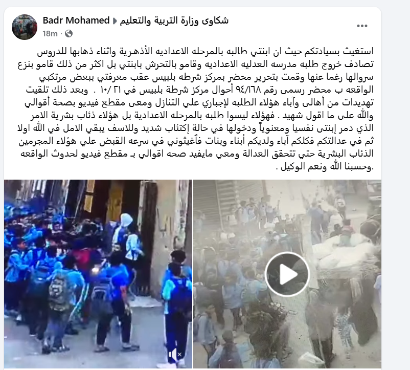 نشر بدر محمد استغاثة عاجلة مدعومة بالفيديو عبر جروب شكاوى وزارة التربية والتعليم عبر فيس بوك ، أكد خلالها من تعرض ابنته طالبة الإعدادية للتحرش في الشارع من مجموعة من طلاب مدرسة اخرى