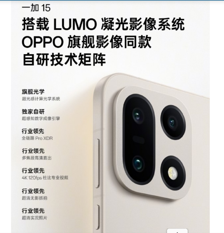 وفقًا لـ لي، يُمثل نظام التصوير Oppo Lumo أعلى مستويات تكنولوجيا التصوير في مجموعة Oppo. وأضاف أن OnePlus 15 سيُقدم أفضل أداء تصويري في تاريخ العلامة التجارية، مُركزًا على العمق والإضاءة ودقة الألوان. ورغم انتهاء الشراكة مع Hasselblad، إلا أن العناصر المميزة، مثل فلسفة الألوان والنغمة الجمالية وأوضاع الكاميرا الرئيسية، مثل الوضع الرئيسي ونسبة العرض إلى الارتفاع الواسعة، قد تم الحفاظ عليها، مما يضمن بقاء تجربة OnePlus البصرية المميزة على حالها.