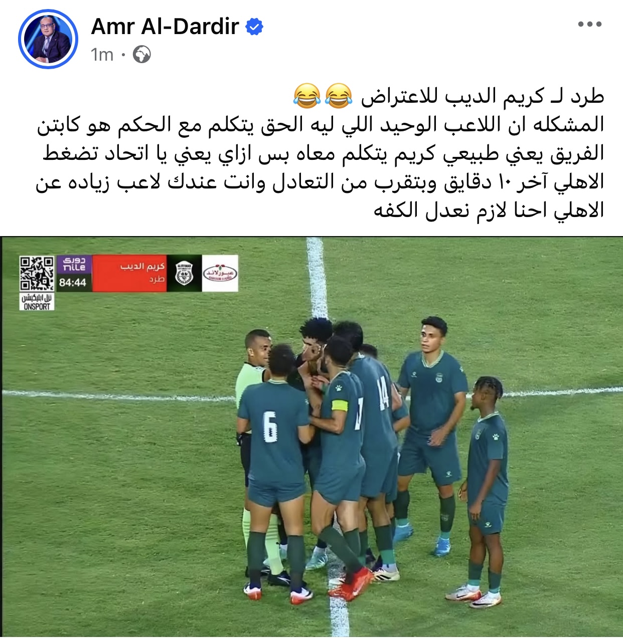 وكتب الدرديري عبر حسابه الشخصي بموقع فيسبوك: “طرد لكريم الديب للاعتراض، المشكله ان اللاعب الوحيد اللي ليه الحق يتكلم مع الحكم هو كابتن الفريق يعني طبيعي كريم يتكلم معاه بس ازاي يعني يا اتحاد تضغط الاهلي آخر ١٠ دقايق وبتقرب من التعادل وانت عندك لاعب زياده عن الاهلي احنا لازم نعدل الكفة".