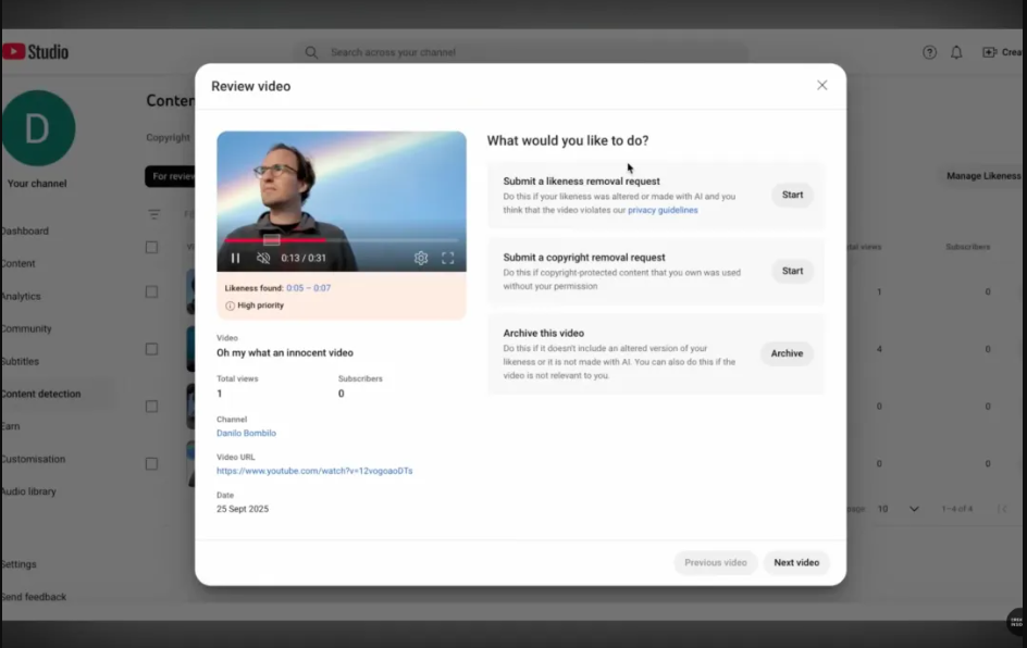 وبحسب الفيديو الرسمي من يوتيوب، يمكن للمبدعين، بعد التحقق من هويتهم، مراجعة الفيديوهات التي تم تحديدها ضمن تبويب "كشف المحتوى" في استوديو يوتيوب، وإذا بدت لهم أن الفيديوهات تحتوي على محتوى مولد بالذكاء الاصطناعي وغير مصرح به، يمكنهم طلب إزالة هذه الفيديوهات.