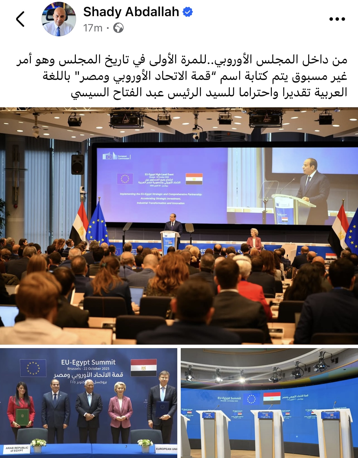 ونشر شادي عبدالله عبر حسابه الرسمي بموقع فيسبوك منشورًا قال فيه: “من داخل المجلس الأوروبي.. للمرة الأولى في تاريخ المجلس، وهو أمر غير مسبوق، يتم كتابة اسم “قمة الاتحاد الأوروبي ومصر” باللغة العربية تقديرًا واحترامًا للسيد الرئيس عبد الفتاح السيسي.”