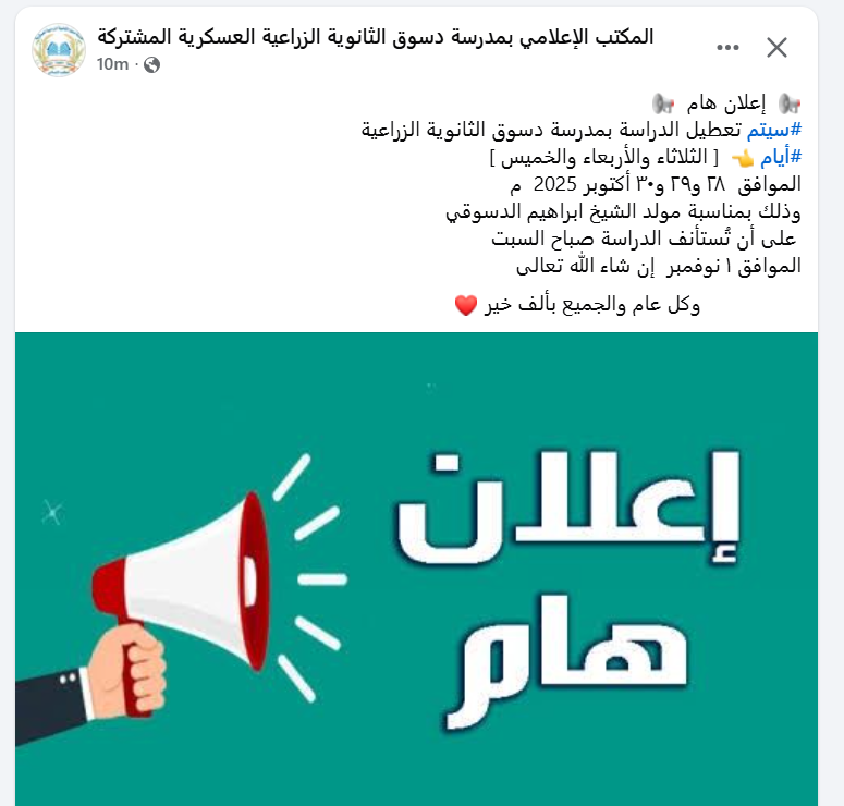 وبذلك تكون هذه المدرسة هي ثاني مدرسة في كفر الشيخ تعلن تعطيل الدراسة بسبب المولد ، حيث أعلنت مدرسة دسوق الثانوية الزراعية بمحافظة كفر الشيخ عبر صفحتها الرسمية على موقع التواصل الاجتماعي فيس بوك ، عن تعطيل الدراسة أيام الثلاثاء والأربعاء والخميس الموافقين ٢٨ و٢٩ و٣٠ أكتوبر 2025 م وذلك بمناسبة مولد الشيخ ابراهيم الدسوقي ، على أن تُستأنف الدراسة صباح السبت ، الموافق 1 نوفمبر .