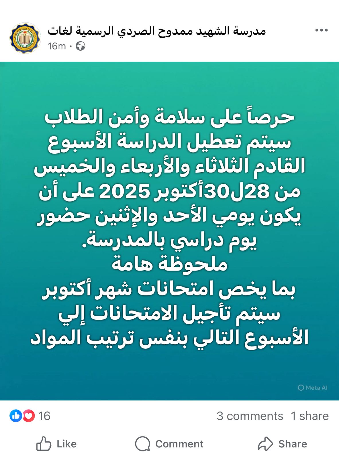 أعلنت الصفحة الرسمية لمدرسة الشهيد ممدوح الصردي الرسمية لغات بمحافظة كفر الشيخ ، تعطيل الدراسة الأسبوع القادم أيام الثلاثاء و الأربعاء والخميس من 28 حتى 30 أكتوبر 2025.