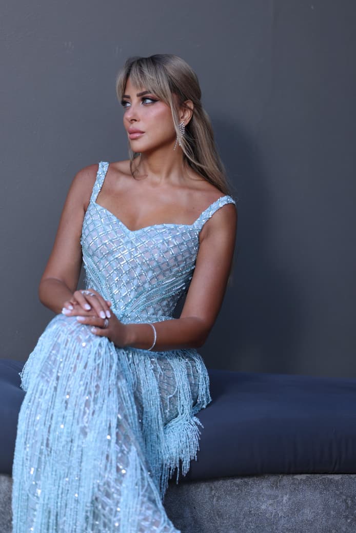 وظهرت ريم بفستان أزرق ثلجي مرصّع بالخرز والتطريزات البراقة مع تفاصيل من الشراريب اللامعة التي منحت الإطلالة حركة انسيابية مفعمة بالحيوية، في تصميم يجمع بين الفخامة والأنوثة الراقية. وتميز الفستان بقصته الضيقة التي أبرزت رشاقتها وأناقة قوامها، و لاقت جلسة التصوير تفاعلًا واسعًا من جمهورها ومتابعيها، الذين أثنوا على إطلالتها ووصفوها بأنها واحدة من أجمل إطلالات مهرجان الجونة السينمائى هذا العام.