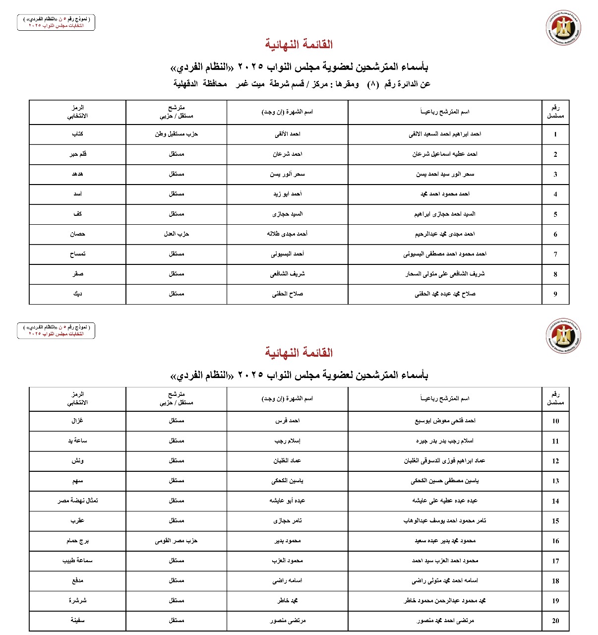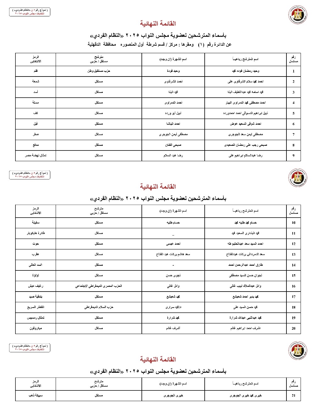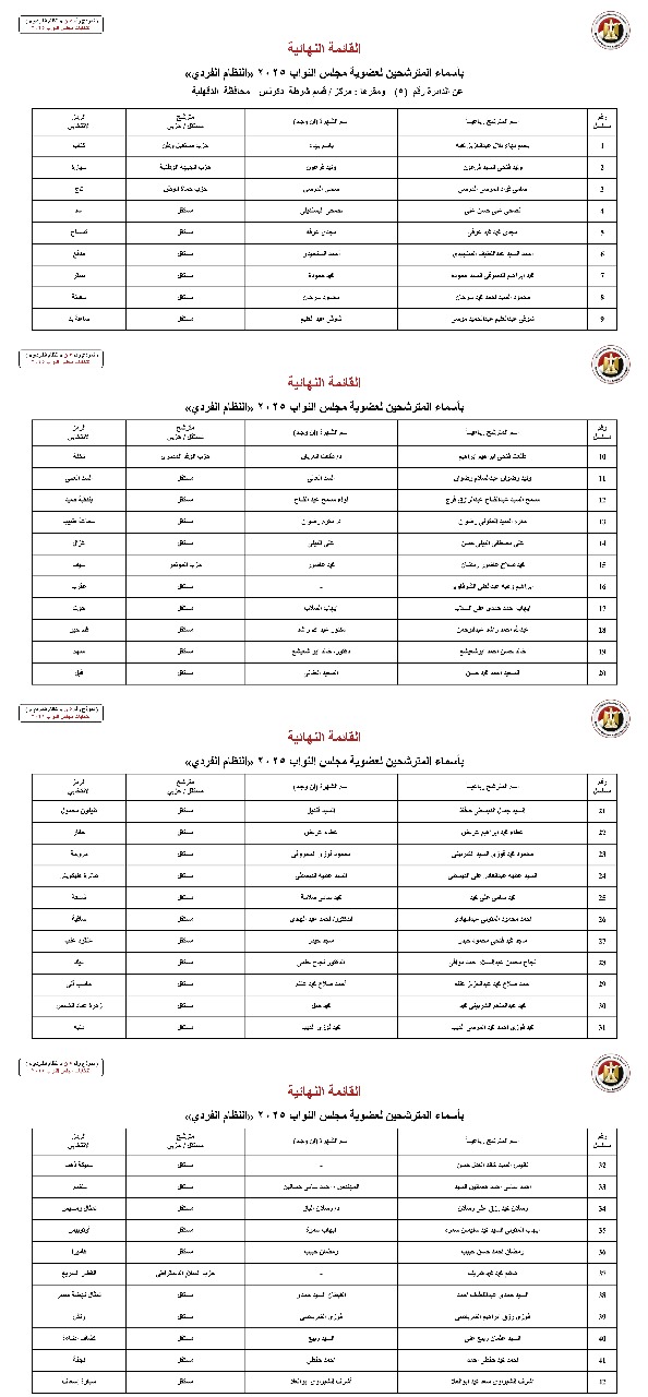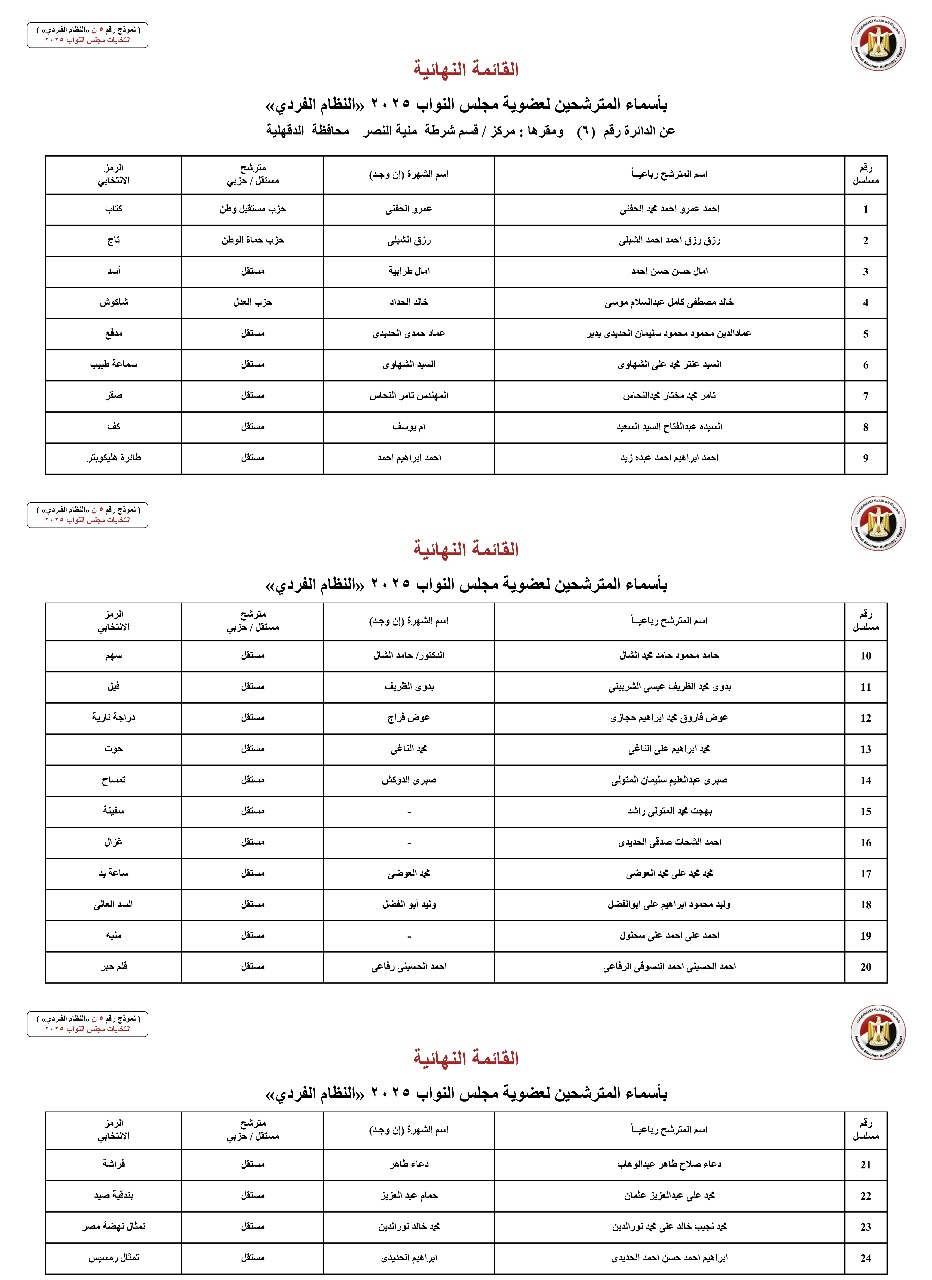 حصل "صدى البلد" على القائمة النهائية لمرشحي دوائر محافظة الدقهلية عن النظام الفردي لانتخابات مجلس النواب.