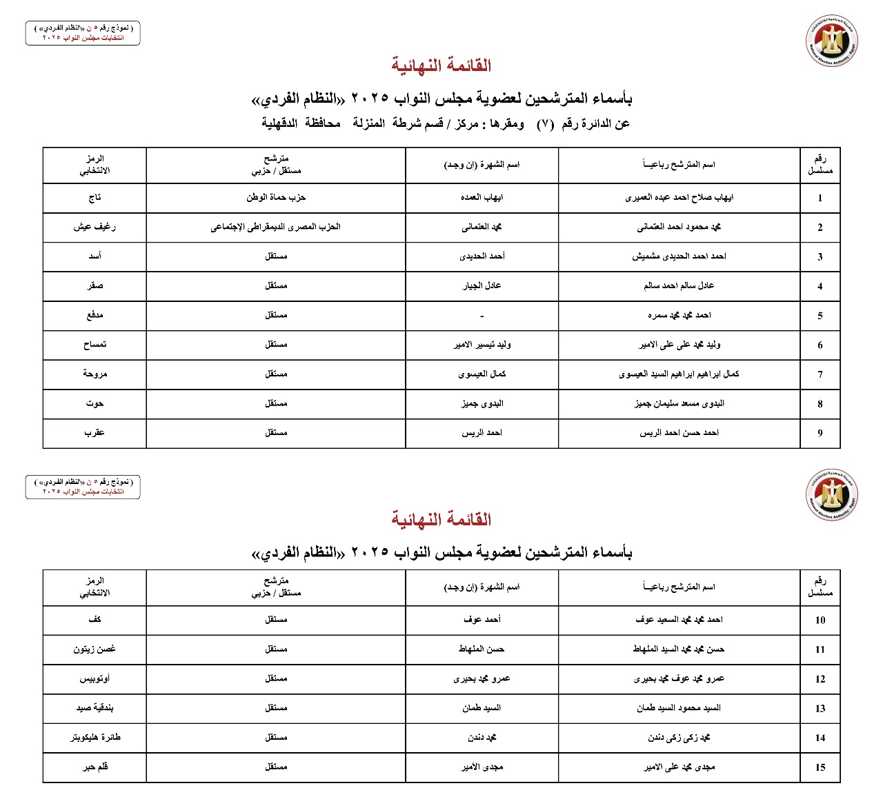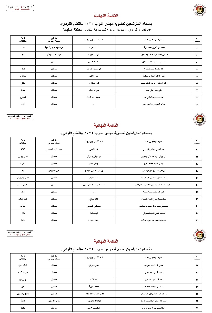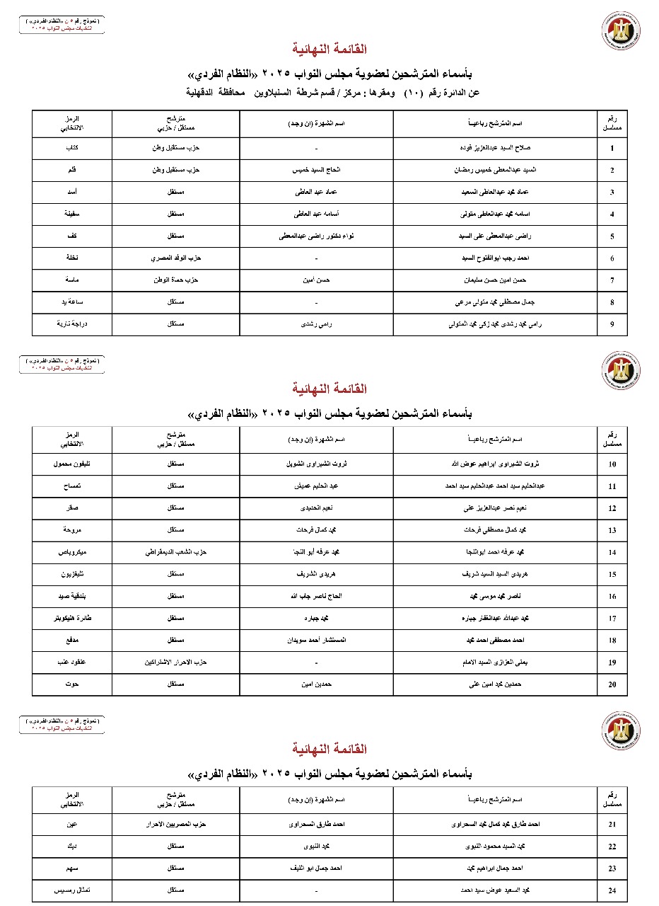 حصل "صدى البلد" على القائمة النهائية لمرشحي دوائر محافظة الدقهلية عن النظام الفردي لانتخابات مجلس النواب.