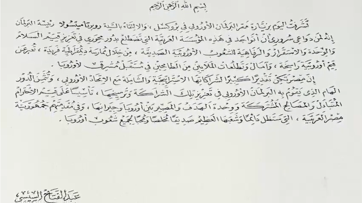 وأكمل الرئيس السيسي: "من خلال ممارسة ديمقراطية فريدة، تعبر عن قيم أوروبية راسخة وآمال وتطلعات الملايين من الطامحين في مستقبل مشرق لأوروبا".