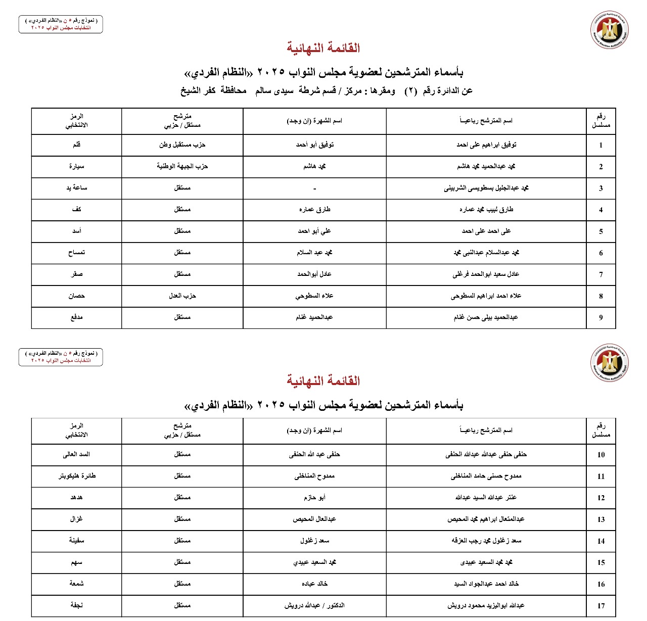 حصل "صدى البلد" على القائمة النهائية لمرشحي دوائر محافظة كفر الشيخ عن النظام الفردي لانتخابات مجلس النواب.