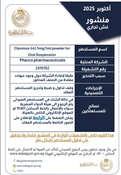وذكرت الهيئة في بيانها أن التشغيلة رقم "2410102" من دواء "Clavimox 642.9mg/5ml powder for Oral Suspension" تبين أنها مقلدة وليست من إنتاج الشركة الأصلية، وذلك بعد ورود إفادة رسمية من الشركة المنتجة تؤكد اكتشاف عبوات مزيفة من نفس الصنف يتم تداولها حاليًا في بعض الأسواق.