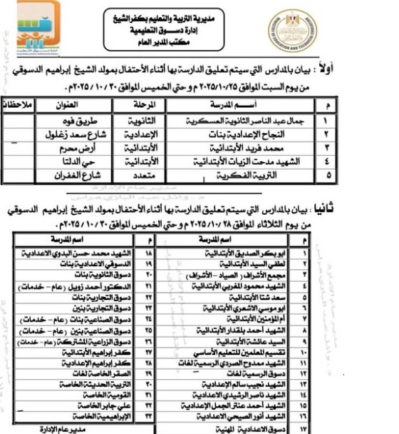 كما تضمنت تعليق الدراسة لمدة 3 أيام بباقى مدارس المدينة بالإضافة إلى مدرستى كفر إبراهيم الابتدائية والإعدادية لمدة 3 أيام ابتداءً من يوم الثلاثاء الموافق 28 أكتوبر وحتى يوم الخميس الموافق 30 من ذات الشهر.