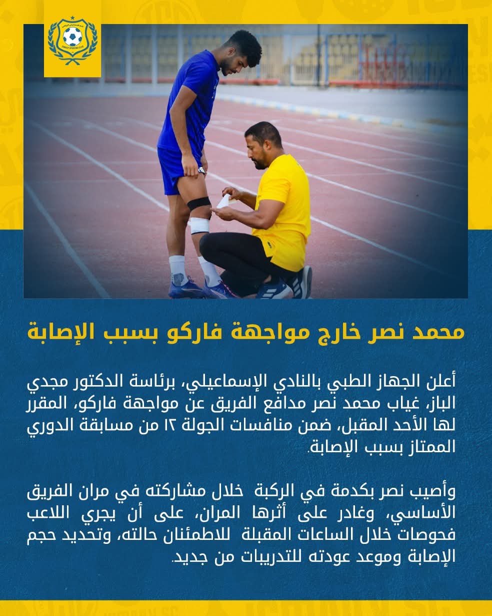 أعلن الجهاز الطبي بالنادي الإسماعيلي، برئاسة الدكتور مجدي الباز، غياب المدافع محمد نصر عن مواجهة فريقه المقبلة أمام فاركو، المقررة غدا الأحد ضمن منافسات الجولة الثانية عشرة من دوري نايل.