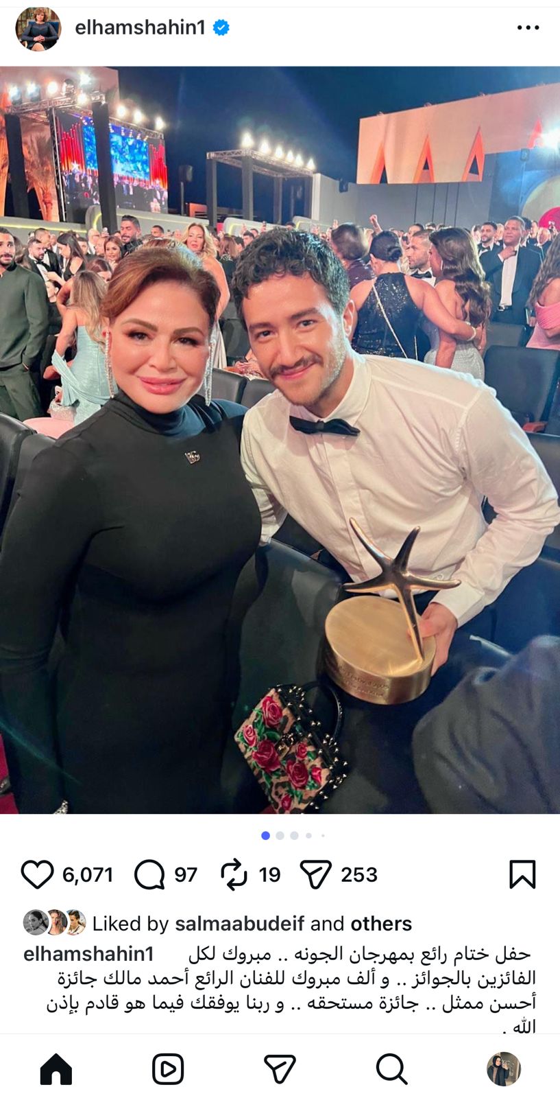 وكتبت إلهام شاهين عبر حسابها على انستجرام: “حفل ختام رائع بمهرجان الجونة مبروك لكل الفائزين بالجوائز، مبروك للفنان الرائع أحمد مالك أفضل ممثل، جائزة مستحقة ربنا يوفقك فيما هو قادم”.