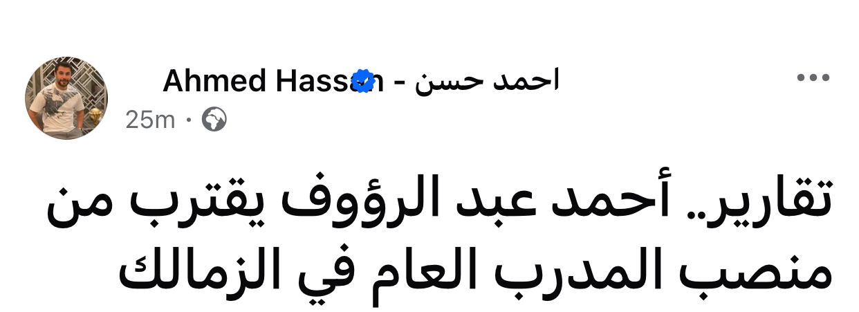 وكتب أحمد حسن على حسابه الشخصي بموقع فيسبوك: "أحمد عبدالرؤوف يقترب من منصب المدرب العام في الزمالك".