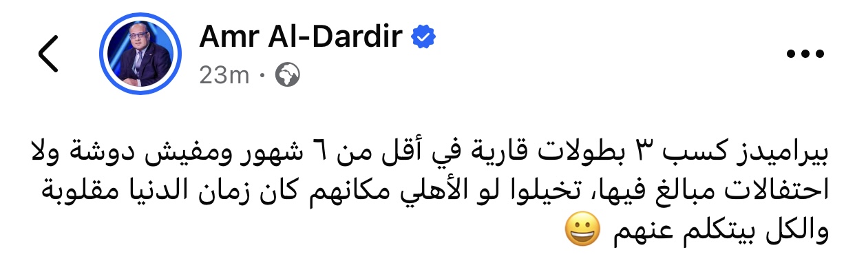 وكتب الدرديري: “بيراميدز كسب ٣ بطولات قارية في أقل من ٦ شهور ومفيش دوشة ولا احتفالات مبالغ فيها، تخيلوا لو الأهلي مكانهم كان زمان الدنيا مقلوبة والكل بيتكلم عنهم”.