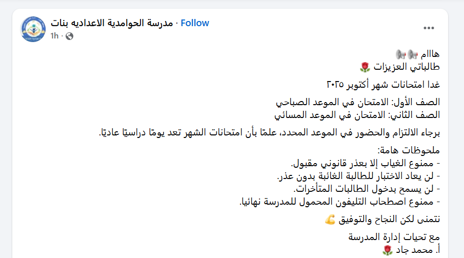 ونبهت المدارس على جميع الطلاب بعدم التخلف عن حضور امتحانات شهر أكتوبر 2025 ، حيث أن درجة امتحان الشهر أساسية في نتيجة امتحانات الترم الاول ، مؤكدةً أنه لن يسمح بإعادة الامتحان لأي طالب