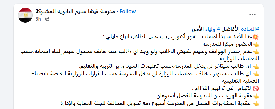 وشملت تنبيهات المدارس للطلاب مع انطلاق امتحانات شهر أكتوبر 2025 فيما يلي :