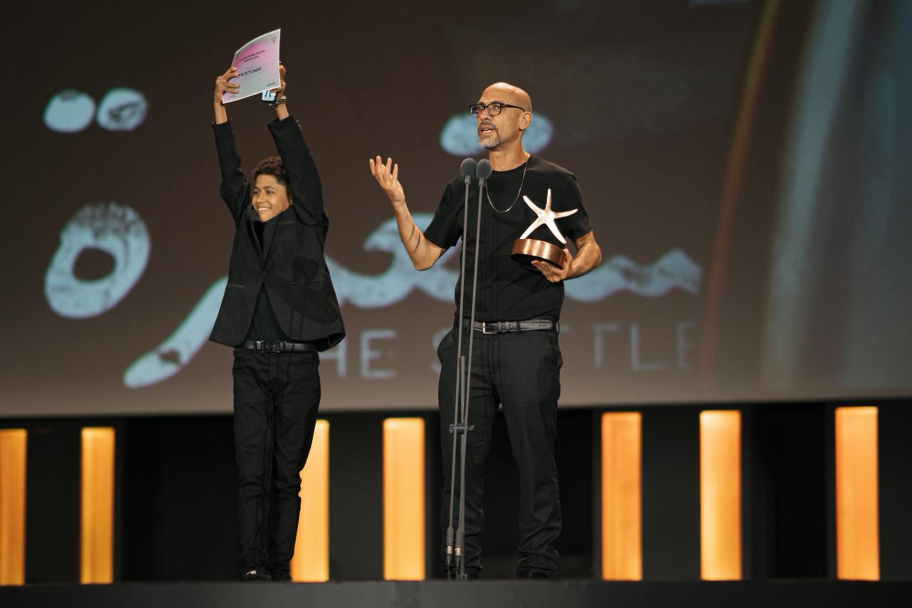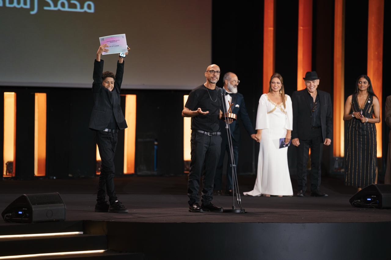 وفي لحظة مؤثرة، انضم إليه الطفل الممثل زياد إسلام لتسلّم الجائزة، موجّهًا شكره لكل القائمين على مهرجان الجونة.
